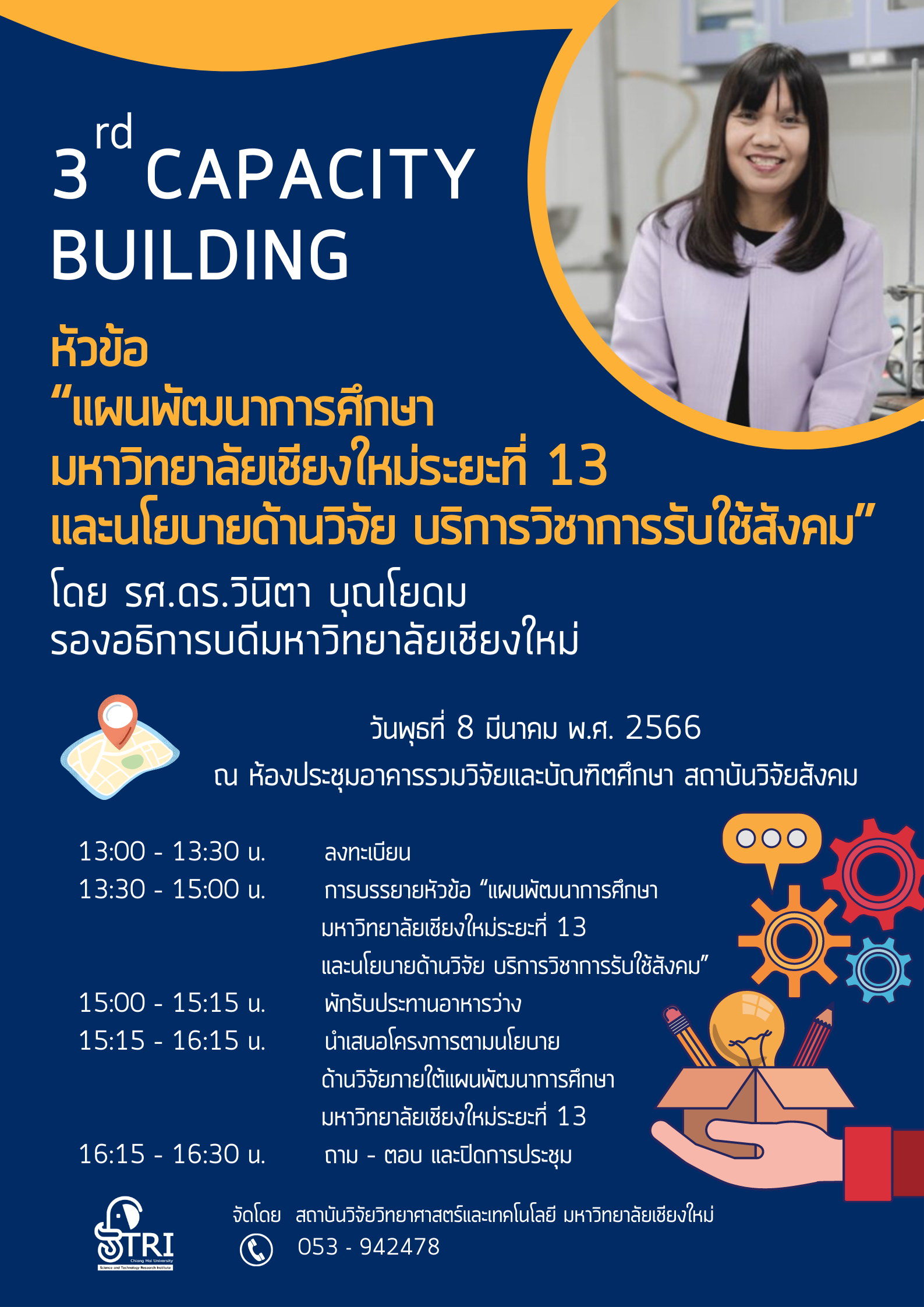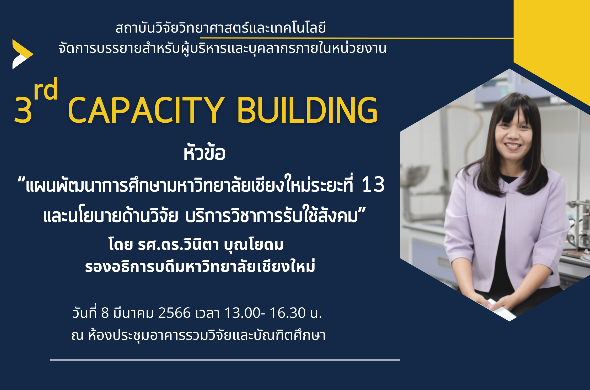 สถาบันวิจัยวิทยาศาสตร์และเทคโนโลยี จัดกิจกรรม capacity building ครั้งที่ 3 ในหัวข้อ "แผนพัฒนาการศึกษามหาวิทยาลัยเชียงใหม่ ระยะที่ 13 และนโยบายด้านวิจัย บริการวิชาการรับใช้สังคม" โดย รศ.ดร.วินิตา บุญโยดม รองอธิการบดีมหาวิทยาลัยเชียงใหม่ สำหรับผู้บริหารและบุคลากรภายในหน่วยงาน ณ ห้องประชุมอาคารรวมวิจัยและบัณฑิตศึกษา สถาบันวิจัยสังคม